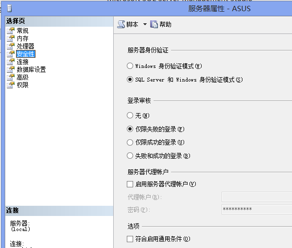 2、左側選擇“安全性”,選中右側的“SQL Server 和 Windows 身份驗證模式”以啟用混合登錄模式
