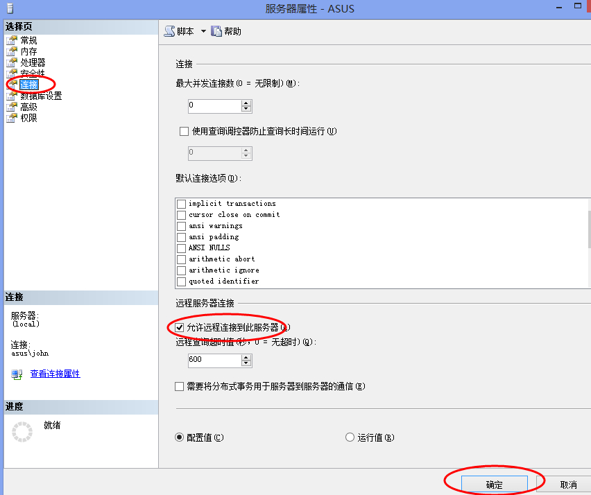 3、選擇“連接”,勾選“允許遠程連接此服務器”,然后點“確定”