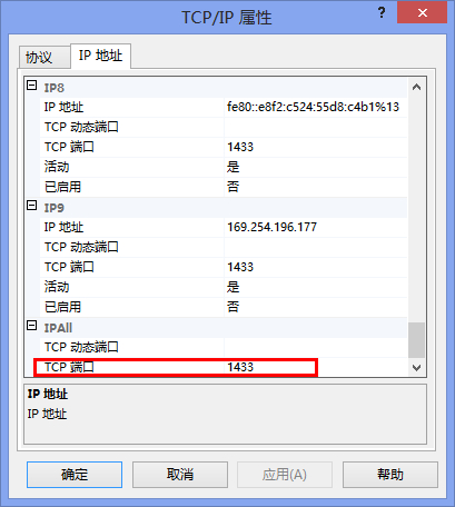 12、選擇“IP地址”選項卡,設置端口“1433”