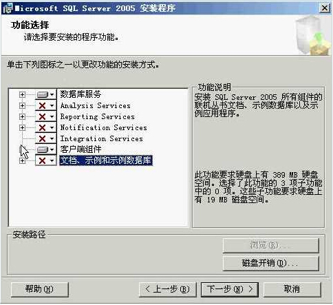 注意:下面這一步,至少要把第一項選中,如果還想在用SQL SERVER2005中查看幫助信息,則要將最后一項選中,其它的選項視情況可選。如果不想安裝visual studio2005可以按下圖操作。