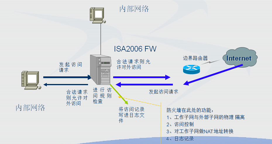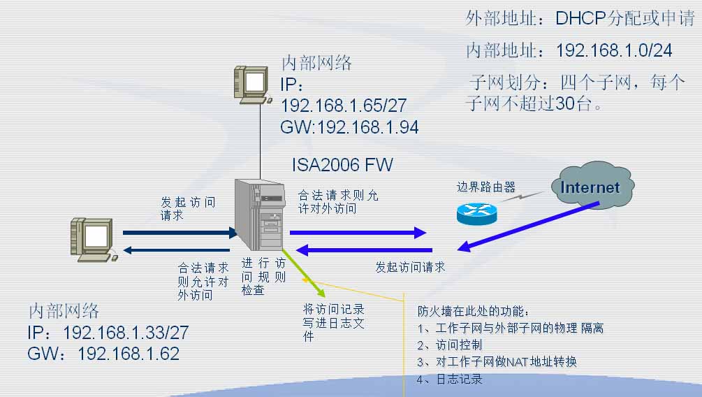 在今天的企業(yè)網(wǎng)組建中,少不了重要的網(wǎng)絡(luò)安全設(shè)備即防火墻。有人做過統(tǒng)計,80%的企業(yè)購買網(wǎng)絡(luò)安全產(chǎn)品首選防火墻,什么樣的防火墻受如此歡迎呢?。防火墻有硬件和軟件之分,硬件防火墻性能好,但價格高,升級慢;軟件防火墻價格相對低,升級快而方便,但性能稍微差一些,由于計算機運行速度快,這個問題是可以克服的。因此軟件防火墻中,微軟的ISA Server2006防火墻功能強,性能好,適合大中型企業(yè)。防火墻是企業(yè)網(wǎng)安全的基本配置,有很高的性能,有比較多和強大的功能,企業(yè)網(wǎng)的很多安全策略都是依賴防火墻實現(xiàn)的,如何在防火墻上實現(xiàn)這些安全策略?