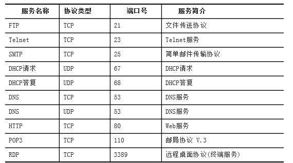 每一項服務,都有一個端口(或多個端口)與之對應,可以使用的端口號從1到65535之間選擇,系統服務通常使用1024以下的端口。使用哪個端口號提供服務都可以,但對于一些常見的服務,通常使用一些固定的端口,例如Web服務使用TCP的80端口,FTP服務使用TCP的21端口,Windows終端服務使用TCP的3389端口等,要使用防火墻及代理服務器,首先要記住一些常見的端口號,表11-2列出了常見服務及對應的端口號,請大家參考。