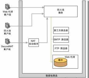 “防火墻客戶端”是已經安裝并啟用防火墻客戶端軟件的計算機。來自防火墻客戶端的請求會定向到 ISA Server計算機上的防火墻服務,以確定是否允許訪問。此后,可以使用應用程序篩選器和其他插件對這些請求進行篩選。防火墻服務還可以緩存所請求的對象,或者從 ISA Server緩存提供對象。