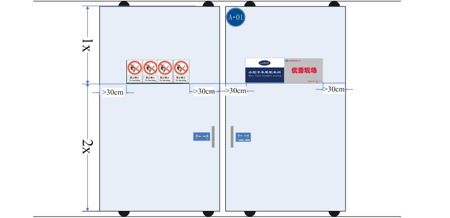 3.通用標(biāo)識、廠房副門牌、所獲獎牌張貼在房門整體高度的2/3處。如雙扇門,左側(cè)為通用標(biāo)識,右側(cè)為副門牌和所獲獎牌。