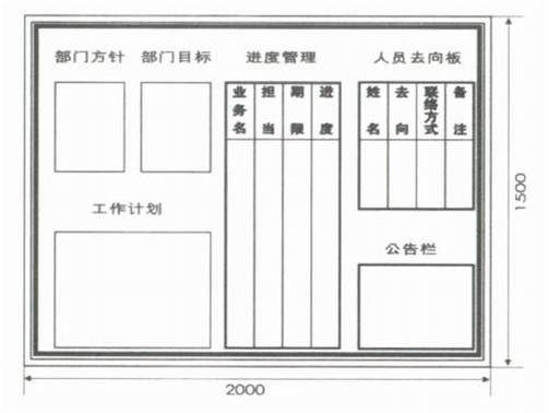 1.制作管理看板,內(nèi)容包括:部門(mén)年度方針戰(zhàn)略、年度目標(biāo)、每月計(jì)劃、進(jìn)度管理、人員去向、公告欄,如圖所示。