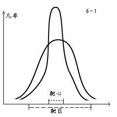 “你們大概看過這條線不止一次了。”雖然如此,我仍然解釋:“這個射手連靶區也沾不上的幾率的確很低,射中靶心的幾率也不會是百分之百,但比射中靶區其他位置的幾率高。而這條就是另外一位更出色的射手的幾率分布線。”然后我畫了另外一條更窄更高的高斯曲線。(圖6-1)