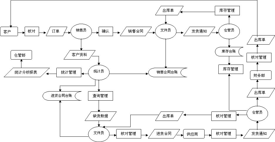 業務流程分析可以幫助我們了解某項業務的具體處理過程,發現和處理系統調查工作中的錯誤和疏漏,修改和刪除原系統中不合理部分,在新系統基礎上優化業務處理流程。現通過調查,采用系統流程圖的部分圖形工具來規范說明公司的業務活動。業務流程圖中的符號說明如圖2.2所示,業務流程如圖2.3所示: