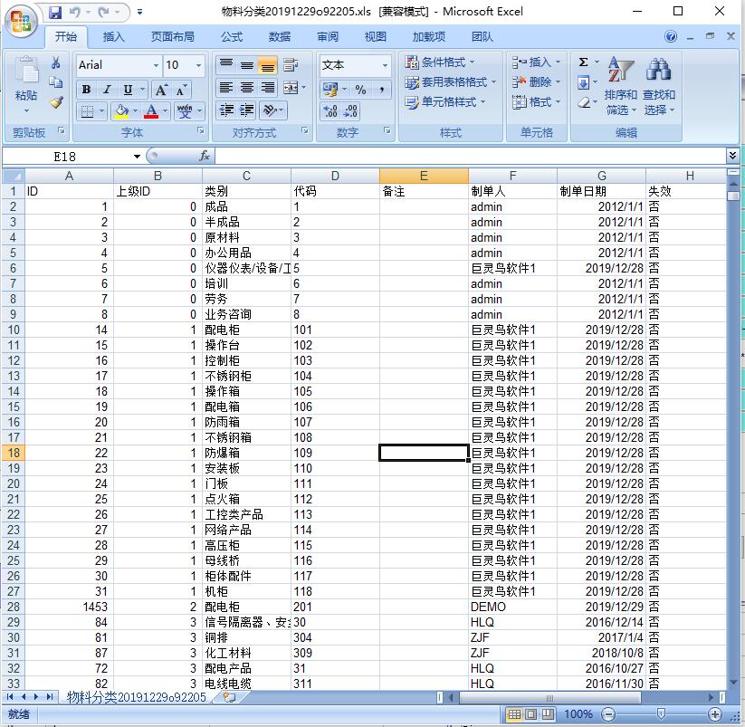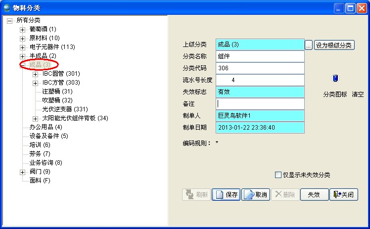 在巨靈鳥ERP中默認的分類為:成品、半成品、原材料、辦公用品、設備及備件、培訓、勞務、業務咨詢