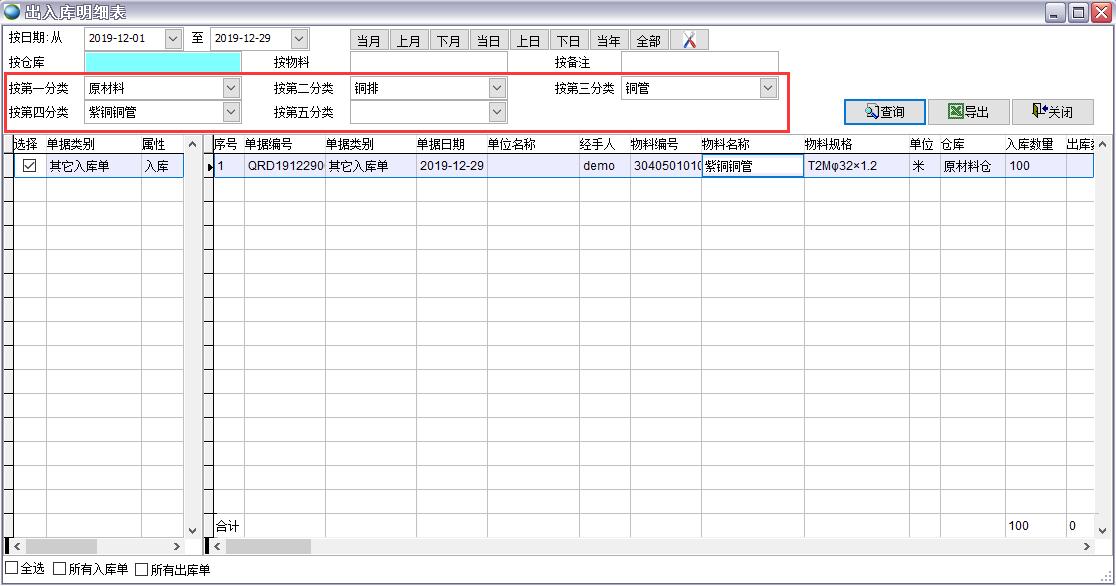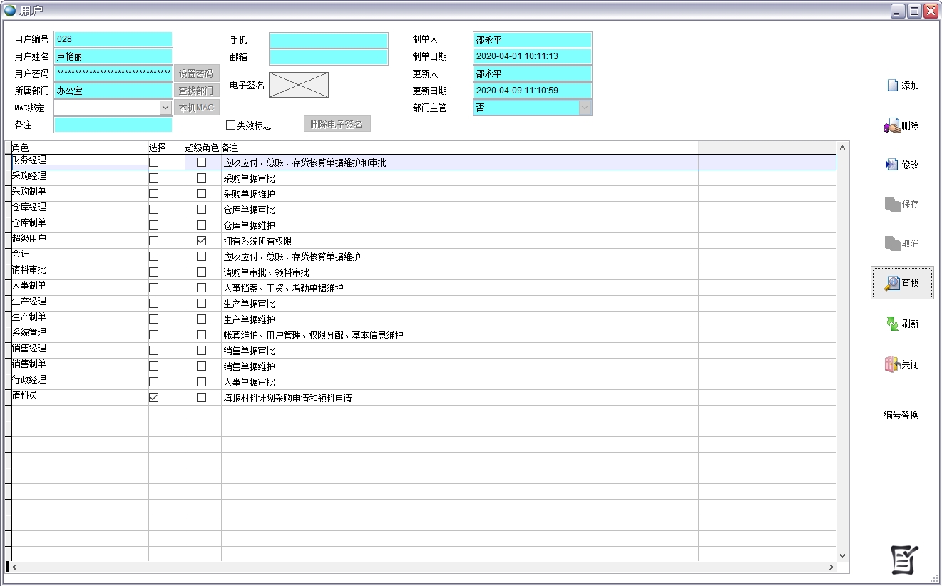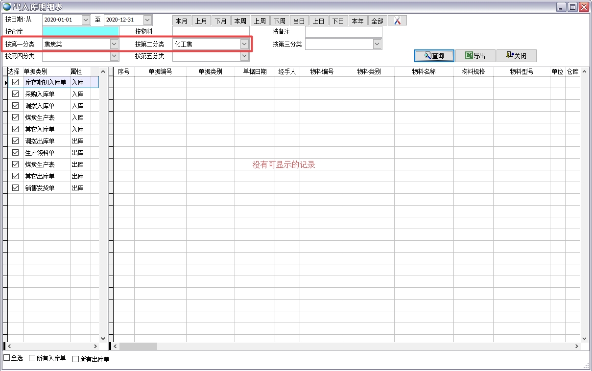 如上圖所示禁止這些部門查看化工焦類別的物料信息,那么下面這個用戶屬于辦公室的,她就無法在物料編碼表、現今庫存、所有出入庫單據、庫存的各種報表中看到化工焦類別的物料數據。