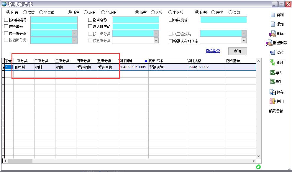 可以將物料分類做成excel文件一次性導入。導入文件格式在安裝目錄\數據導入模板\物料分類.xls