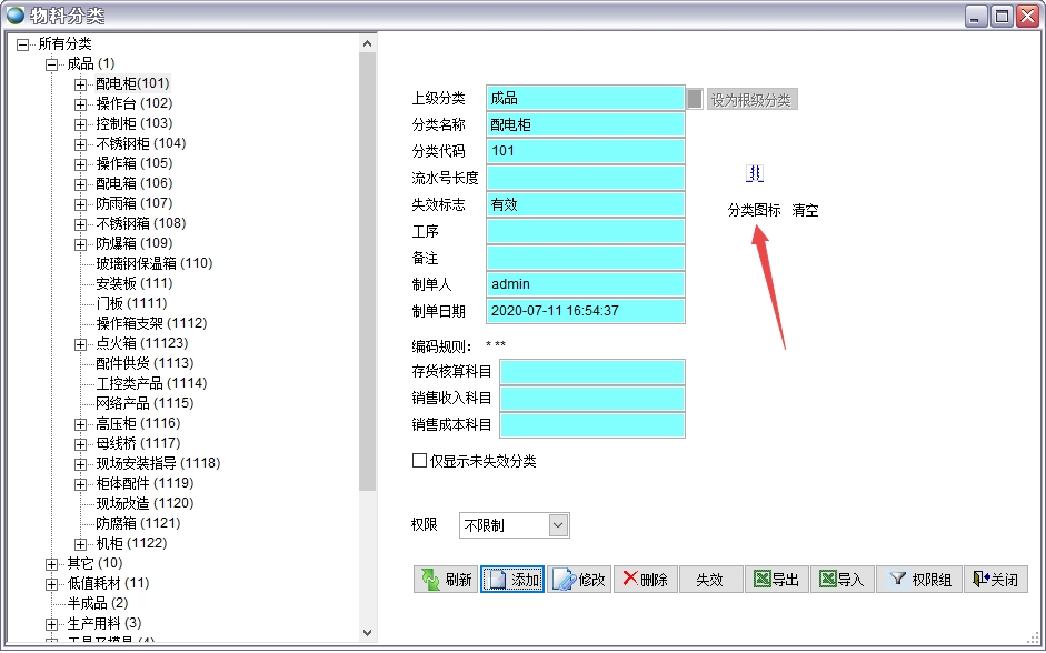 在左側樹狀圖中選中需添加下級分類的分類,如下圖,需在成品下添加下級分類組件。成品編號是以3開頭,組件編號是以306開頭,流水號4位,則最終生成的編碼從3060001到3069999。