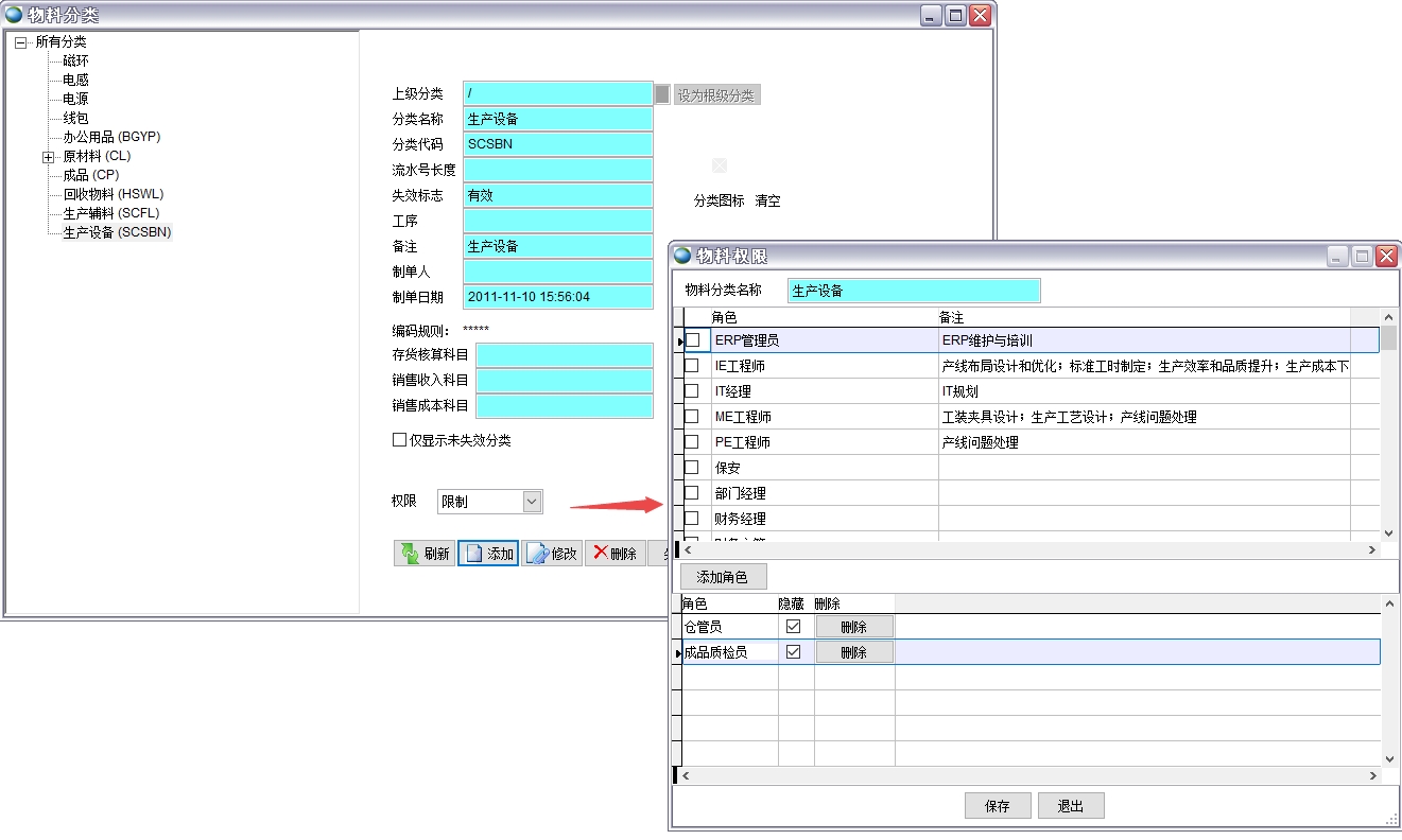 如果某類物料不希望某些用戶看到,可以設置權限組