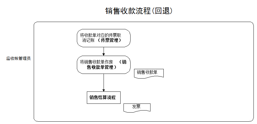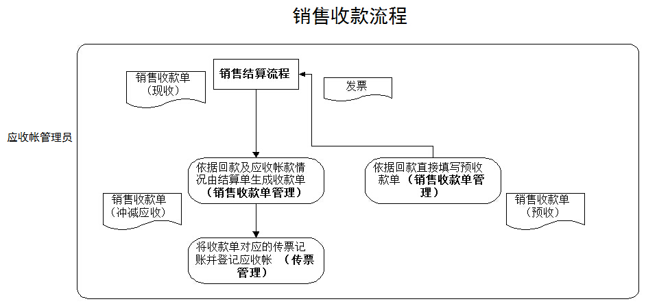 對于現款現貨的業務,現結類型的銷售結算單確定時產生銷售收款單。沖減應收的業務需要應收帳管理員在系統中依據回款由銷售單生成收款單。預收款的業務由應收帳管理員依據回款直接填寫預收類型的收款單,后續由銷售結算流程進行預收款轉出。收款單確定后應收帳管理員將對應的傳票記賬,登記應收帳。進行銷售收款回退業務時需要先將收款單對應的傳票取消記賬,然后作廢銷售收款單。