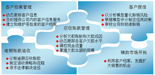 5、信用管理的四項傳統(tǒng)/主要職能(客戶檔案管理、客戶授信、應(yīng)收賬款管理、逾期賬款追收)和一項新興/輔助職能(輔助市場開拓)