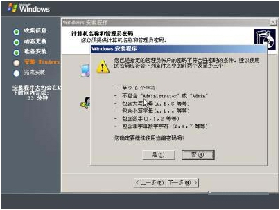 安裝程序自動為你創(chuàng)建又長又難看的計算機名稱,自己可任意更改,輸入兩次系統(tǒng)管理員密碼,請記住這個密碼,Administrator系統(tǒng)管理員在系統(tǒng)中具有最高權(quán)限。密碼長度少于6個字符時會出現(xiàn)如下圖所示的提示信息。
