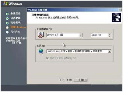 日期和時間設(shè)置不用講,選北京時間,點“下一步”繼續(xù)安裝,復制文件、安裝網(wǎng)絡(luò)系統(tǒng)。