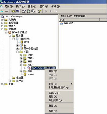 4、在Exchange系統管理器中找到郵件服務器SERVERVM下的“協議”,然后選擇POP3下的“默認POP3虛擬服務器”,在右擊選項中啟動該服務即可: