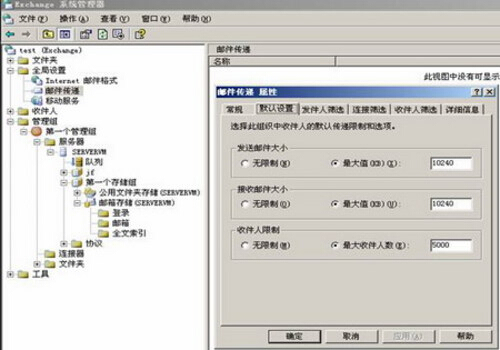 16、另外,在Exchange系統管理器中,打開“全局設置”,右擊“郵件傳遞”,在屬性頁中可對發送,接收郵件大小,發件人或收件人篩選等基本項目作相應設置: