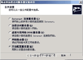 圖1-4 選擇手動(dòng)配服務(wù)器,實(shí)際上這是最簡單的配置方法,我們暫時(shí)撇開復(fù)雜的概念,這個(gè)選擇實(shí)際上已經(jīng)將大部分我們需要的功能完成了。按下一步然后完成,系統(tǒng)會(huì)詢問是否啟動(dòng)路由和遠(yuǎn)程訪問服務(wù),回答是。然后我們又回到管理界面。見圖1-5