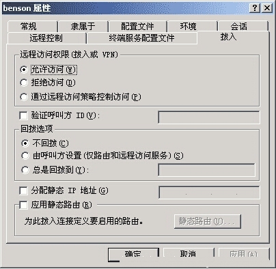 圖1-7 輸入其實(shí)抵制和結(jié)束地質(zhì),注意地址數(shù)量必須比最大的接入數(shù)量多一個(gè),因?yàn)榉⻊?wù)總是占用地址段的第一個(gè)地址。 1.4 配置訪問權(quán)限 用戶必須有相應(yīng)的權(quán)限才能使用接入服務(wù),這個(gè)權(quán)限是在用戶管理工具中配置的。如果使用活動(dòng)目錄則必須使用活動(dòng)目錄的擁護(hù)和計(jì)算機(jī)進(jìn)行管理,如果使用本機(jī)的賬號則使用計(jì)算機(jī)管理中的用戶和組的功能。 遠(yuǎn)程撥入的權(quán)限是一個(gè)個(gè)用戶配置的,默認(rèn)情況下所有用戶都沒有撥入權(quán)限。我們在用戶管理中選擇需要撥入的用戶,打開屬性對話框,選擇撥入頁面。在遠(yuǎn)程訪問權(quán)限中選擇“允許訪問”即可,見圖1-8