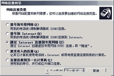 圖1-8 四、配置客戶端 這里介紹的客戶端指的是單臺(tái)PC連接VPN服務(wù)器的情況,即單機(jī)和網(wǎng)絡(luò)的連接。關(guān)于網(wǎng)絡(luò)到網(wǎng)絡(luò)的連接我將在后續(xù)的文章介紹。 單機(jī)連接2000Server做的VPN服務(wù)器非常簡單,和平時(shí)Modem撥號上網(wǎng)差不多。區(qū)別在于原來填寫電話號碼的地方現(xiàn)在必須填寫VPN服務(wù)器的Ip地址或域名。另外我們需要記住VPN是一種建立在已有的網(wǎng)絡(luò)連接上的一種專用連接,即人和VPN都需要一個(gè)底層的網(wǎng)絡(luò)連接,我們可以在建立VPN撥號連接的時(shí)候指定底層連接(如連接互聯(lián)網(wǎng)的撥號連接),這樣在撥VPN的時(shí)候計(jì)算機(jī)會(huì)自動(dòng)撥互聯(lián)網(wǎng)的連接。當(dāng)然你如果使用多種互聯(lián)網(wǎng)連接或直接使用局域網(wǎng)類型的連接?梢圆恢付ㄟ@個(gè)底層連接,在撥VPN之前自己手工撥號上互聯(lián)網(wǎng)。 建立VPN撥號連接的方法如下: 首先打開控制面板里面的網(wǎng)絡(luò)和撥號連接,點(diǎn)擊新建連接。系統(tǒng)會(huì)打開撥號連接向?qū),按下一步,進(jìn)入網(wǎng)絡(luò)連接類型的選擇,如圖1-9