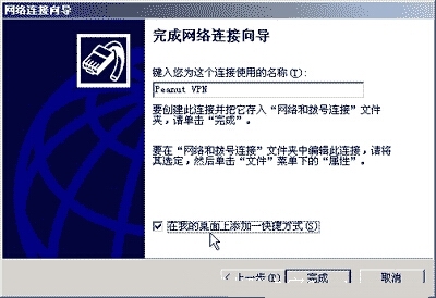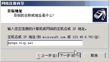 圖1-12 輸入VPN服務(wù)器的IP地址或域名,如果你的VPN服務(wù)器采用的是動(dòng)態(tài)連接,這時(shí)花生殼就顯示出其威力了,只需要輸入了VPN服務(wù)器的動(dòng)態(tài)域名,我們就可以省去大筆固定線路的租用費(fèi)用了。按下一步,輸入新建VPN連接的名稱,見圖1-13