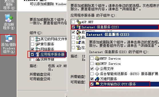 1)單擊開始-控制面板-添加或刪除程序,單擊添加/刪除windows組件,雙擊應用程序服務,雙擊Internat信息服務(IIS),勾選文件傳輸協議(FTP)服務