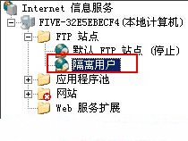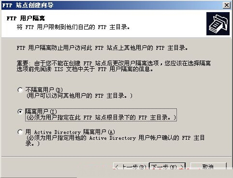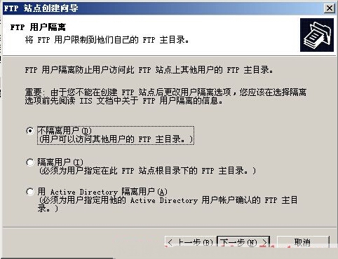三、創建隔離用戶FTP 1)參照創建不隔離用戶FTP第一到第三步,修改第一步的名稱為不隔離用戶 2)選擇隔離用戶