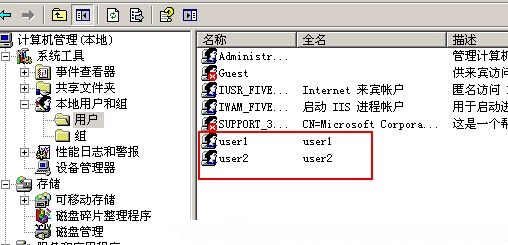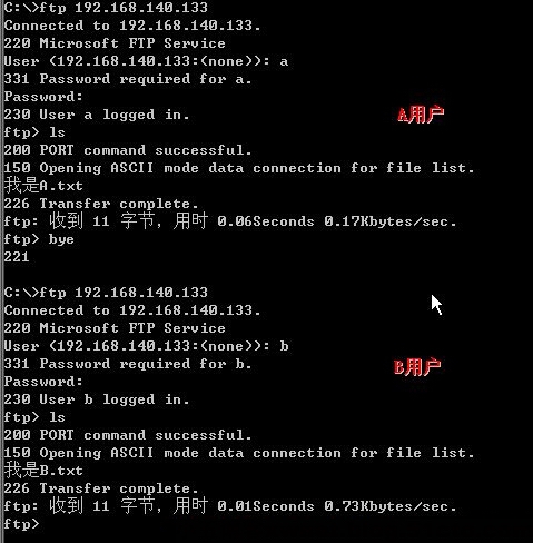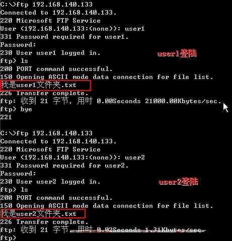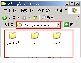 3)參考創建不隔離用戶FTP的第五到第六步 4)FTP站點創建完成 5)建立兩個系統賬戶user1,user2,用于FTP訪問用戶 6)在主FTP目錄下建立相應文件夾,并建立不同文件內容。注意,我們的主目錄是ftp,因為我們選擇的是用戶隔離模式,如果是在工作組模式下,就要在主目錄下建立localuser文件夾,然后在其下建立與各個用戶名相同的文件夾。如果是在域模式,需要在主目錄下建立域服務器的NetBios名的文件夾,然后在其下建立與各個用戶相同的文件夾 7)測試