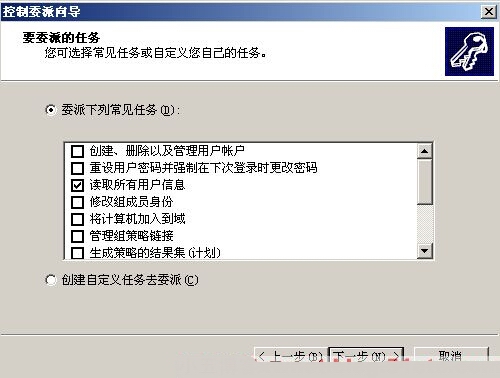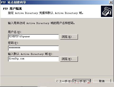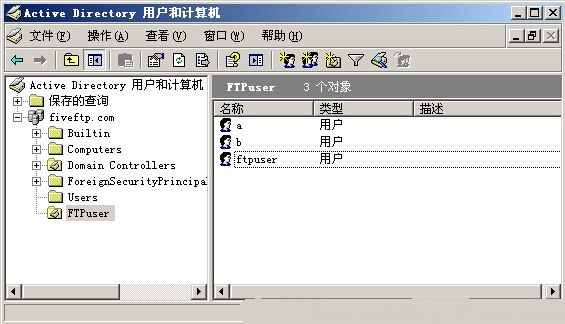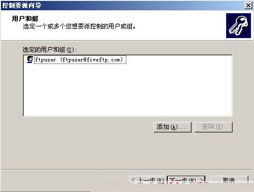 四、創建基于Active Directory隔離用戶的FTP 1、建立主FTP目錄與用戶FTP目錄 2、建立用戶帳戶,用戶a,用戶b,再創建一個讓FTP站點可以讀取用戶屬性的域用戶賬戶FTPuser。 3)FTP站點必須能夠讀取位于AD內的域用戶賬戶的FTProot與FTPdir兩個屬性,才能夠得知該用戶主目錄的位置,因此我們先要為FTP站點創建一個有權限讀取這兩個屬性的用戶帳戶.通過委派控制來實現。右鍵單擊fiveftp.com選擇委派控制,彈出向導單擊下一步繼續 4)設置委派任務 5)新建FTP參見創建不隔離用戶FTP步驟,需要修改隔離方式為Active Directory隔離用戶,修改描述為AD隔離用戶,修改IP為192.168.140.133,端口為21 6)指定Active Directory憑據,單擊下一步后會彈出密碼確認,只需重新輸入一次密碼即可