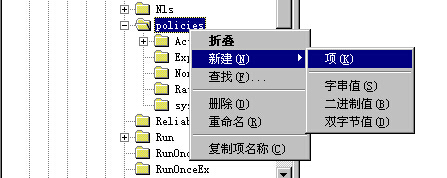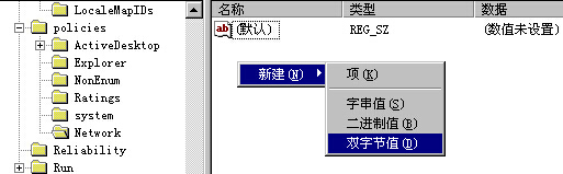 然后進入主鍵: HKEY_LOCAL_MACHINE\Software\Microsoft\Windows\CurrentVersion\Policies 新建Network子鍵(項) 在右側窗口中新建(右鍵選擇“新建”)一個名為AlphanumPwds的雙字節(操作系統的不同,出來的菜單可能有不同,Dword同樣表示雙字節)值,(右鍵選擇”新建”) 數值為1即可。