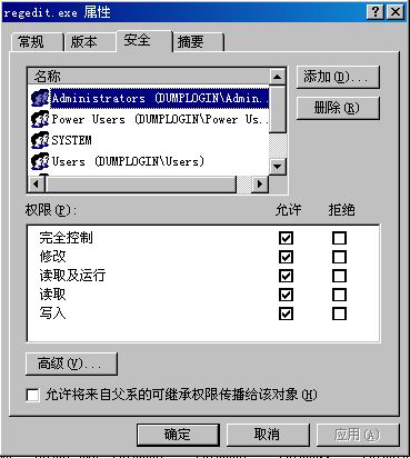 四、系統文件權限的分類 當要給文件設置權限的時候,要首先保證該分區格式為NTFS(Windows NT的文件系統),當然你也可以使用文件分配表(FAT)格式,但是FAT文件系統沒有對文件的訪問權限加以任何限制,FAT只在那些相對來講對安全要求較低的情況下使用。在NTFS文件系統中,可以使用權限對單個文件進行保護,并且可以把該權限應用到本地訪問和網絡訪問中。在NTFS文件系統上,可以對文件設置文件權限,對目錄設置目錄權限,用于指定可以訪問的組和用戶以及允許的訪問等級時。 如果實施了NTFS的文件系統格式,可通過系統的資源管理器直接來管理文件的安全,設置目錄或文件的權限。 以regedit.exe文件為例,右鍵選擇“屬性”, 在“安全”標簽里面選擇不同組的名稱,就可以更改配置他們對該文件的操作權限。 基于文件級的權限可以分配下面幾種:讀取(用戶可以讀取該文件的內容),寫入(用戶可以寫入數據到該文件中),讀取及執行(用戶可以執行該程序),修改(用戶可以修改該文件內容,包括刪除),完全控制(以上所有權限都有)。因此,適當地為不同權限的帳號分配相應的訪問權限(在”允許”,”拒絕”欄分別打勾,如下圖)對于文件系統的安全是致關重要的。
