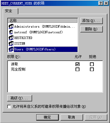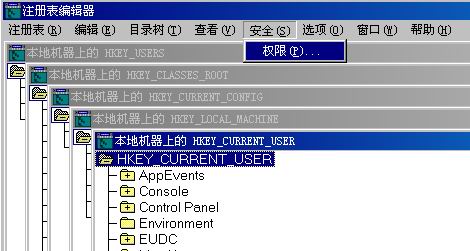 五、如何保護注冊表的安全 Windows NT/2000中的注冊表(Registry)是一系列的數據庫文件,主要存儲在 系統安裝目錄\ System32\Config下,有些注冊表文件建立和存儲在內存中,這些文件的備份也存儲在 系統安裝目錄\Repair下。由于所有配置和控制系統數據最終都存在于注冊表中,而且Registry的缺省權限設置是對“所有人”“完全控制”(FullControl)和“創建”(Create),這種設置可能會被惡意用戶刪除或者替換掉注冊表(Registry)文件。所以,如果注冊表權限沒有設置好的話,整個 Windows NT/2000的系統就不安全,因此我們必須控制注冊表的訪問權。 對于注冊表(Registry),建議應嚴格限制只能在本地進行注冊,不能被遠程訪問,限制對注冊表(Registry)編輯工具的訪問。具體可以利用文件管理器設置只允許網絡管理員使用注冊表編輯工具regedit.exe或regedt32.exe,其他任何用戶不得使用;還可使用第三方工具軟件,比如Enterprise Administrator (Mission Critical Software)來鎖住注冊表(Registry)。或者把對注冊表缺省的所有用戶都能“完全控制”的權利改成只能“讀取”。 在“開始”“運行”里面輸入regedt32如下圖: 假設我們將HKEY_CURRENT_USER支更改成一般用戶只能讀,在菜單中選擇“安全”“權限” 如下圖: 選擇組用戶users(在win2000系統中默認uers是一般用戶,如果在上面列表中沒有定義users組權限,可以選擇”添加”按紐,將該組進行權限設置)