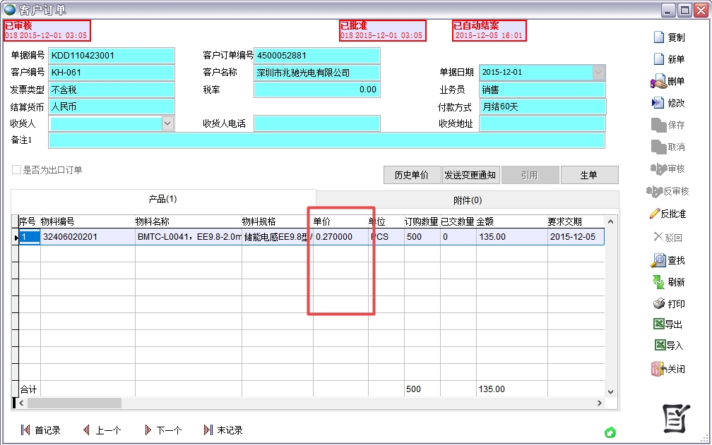 15.1如果在配置文件中不勾選"客戶訂單單價自動獲取與客戶名稱無關",在輸入物料編號后,必須同時滿足該產品有過客戶訂單且是相同的客戶時,單價才會自動出現