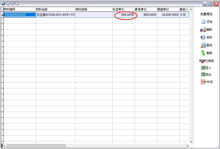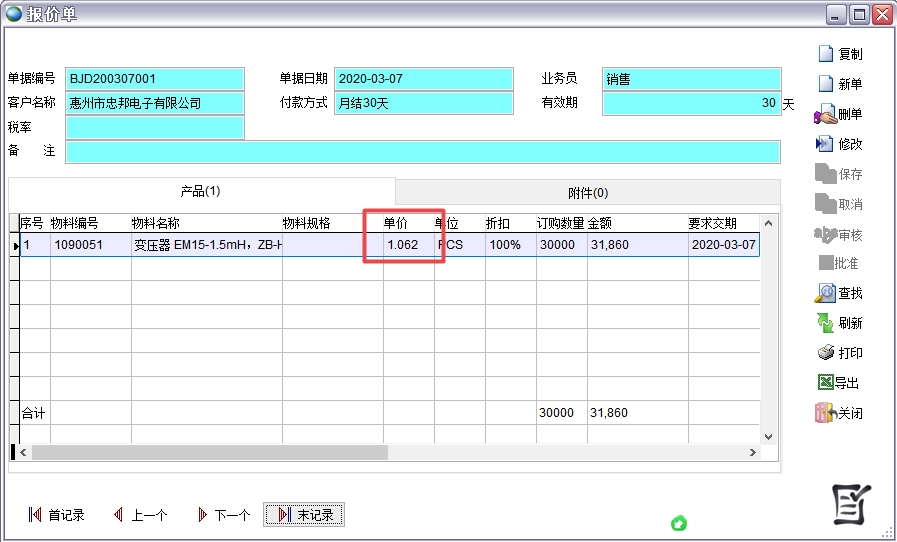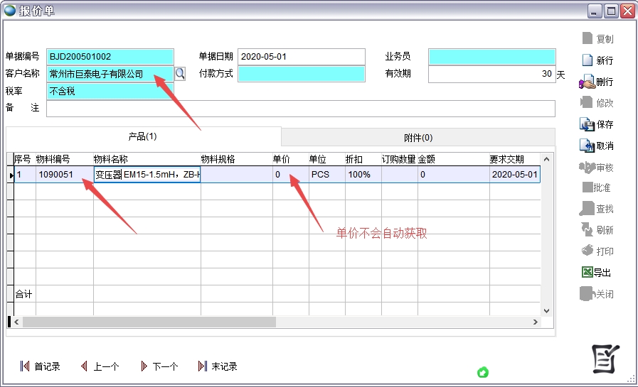 該客戶沒有做過此產品的報價單,所以默認單價為0