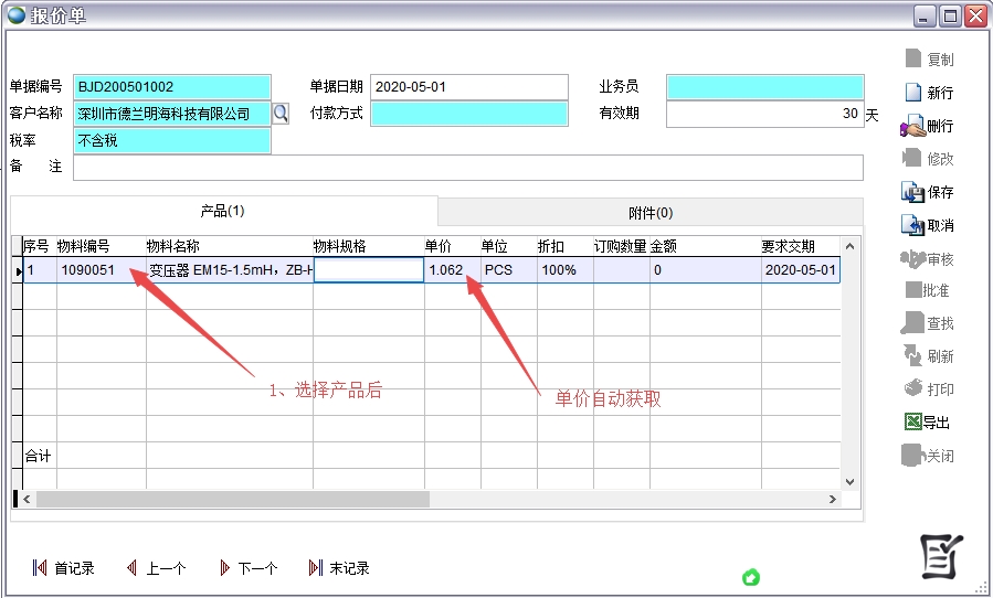 2020年5月1日新建報價單,還是選擇該產品,當選擇該產品后單價會自動出現