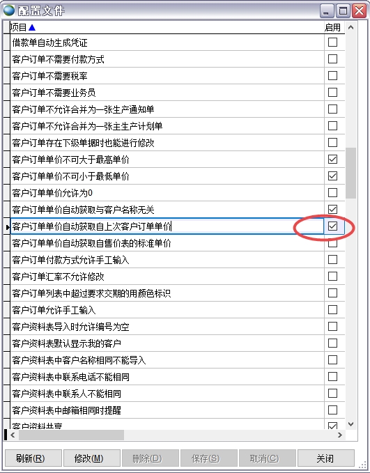 勾選此項后,在新建客戶訂單,選擇客戶、選擇產品后單價自動獲取該客戶上個訂單的單價
