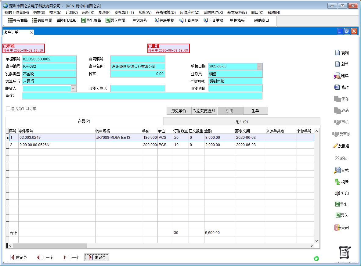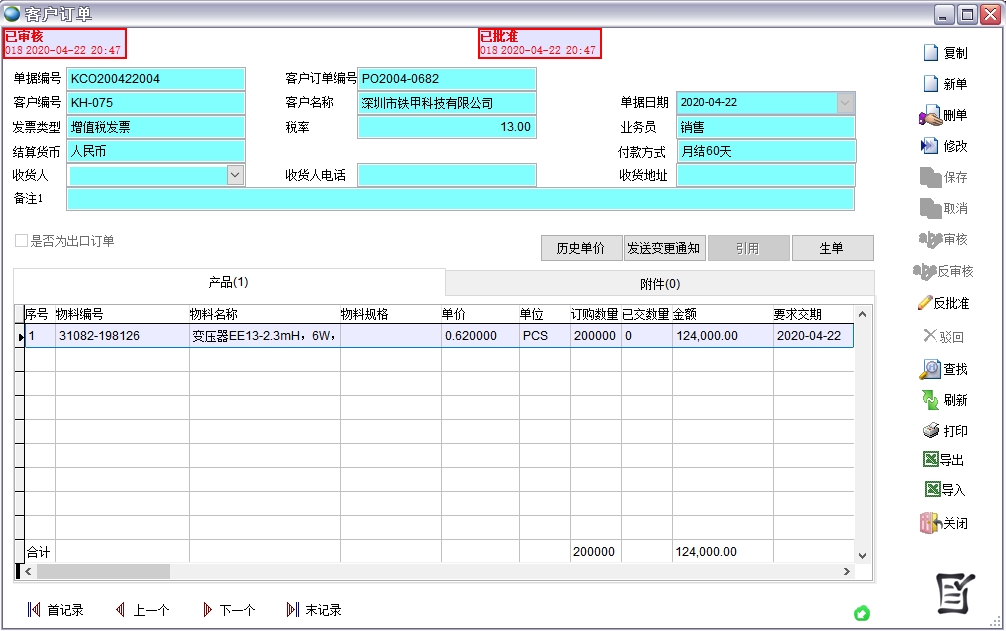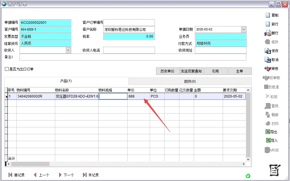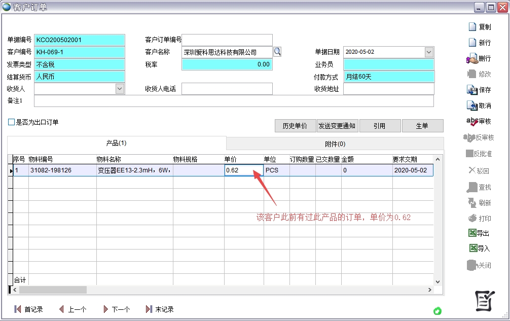 做客戶訂單時,如果該產品之前已經有過客戶訂單,則單價會自動出現上次的單價,如下圖2020年3月7日做過客戶訂單KCO200422004,單價為0.62