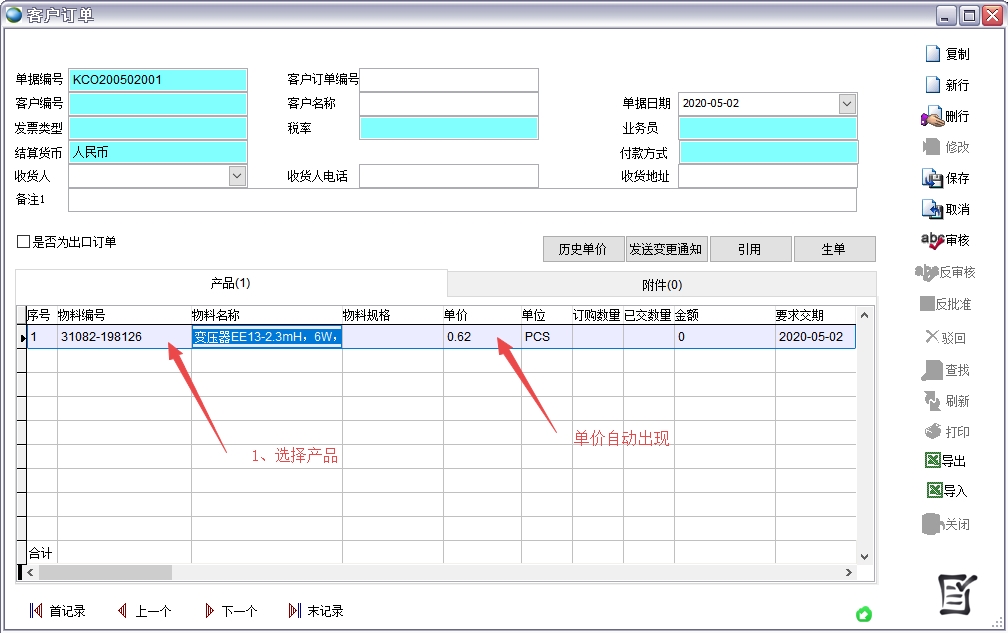 2020年5月2日新建客戶訂單,還是選擇該產品,當選擇該產品后單價會自動出現
