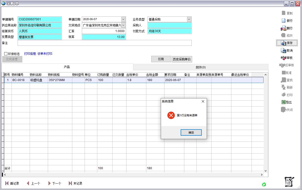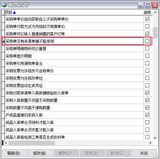 勾選后,采購單必需引用請購單、客戶訂單、詢價單。
