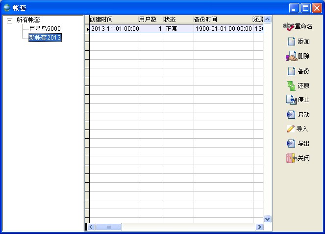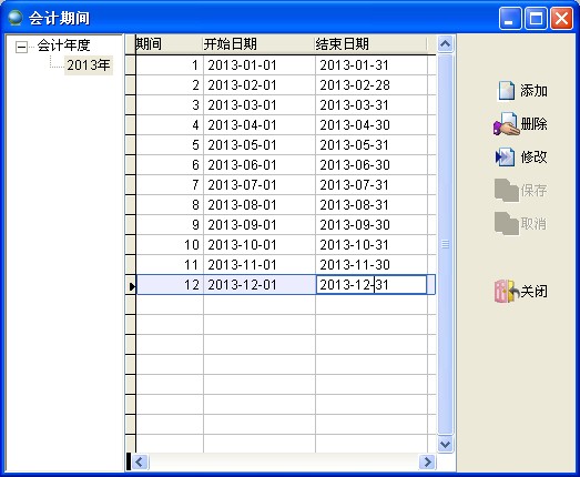 在新建帳套后,此帳套的當年剩余的會計期間會自動建立,如下圖,2013年11月1日新建帳套