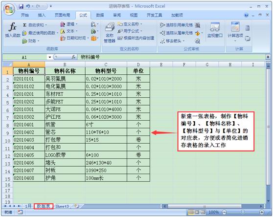 2.第二,新建一張表格,命名為“數據表”,用來存儲【物料編號】、【物料名稱】、【物料型號】和【單位】。