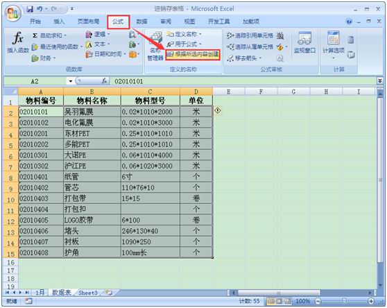 3.下一步,將【物料編號】、【物料名稱】、【物料型號】和【單位】定義成名稱,方便進銷存總表的數據錄入。 步驟:選中【數據表】的A1:B11區域,點擊【公式】-【根據所選內容創建】。