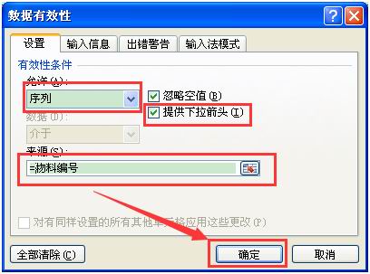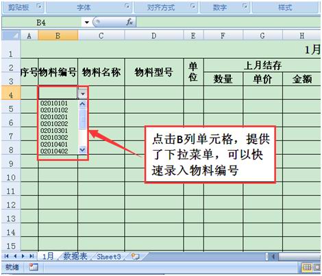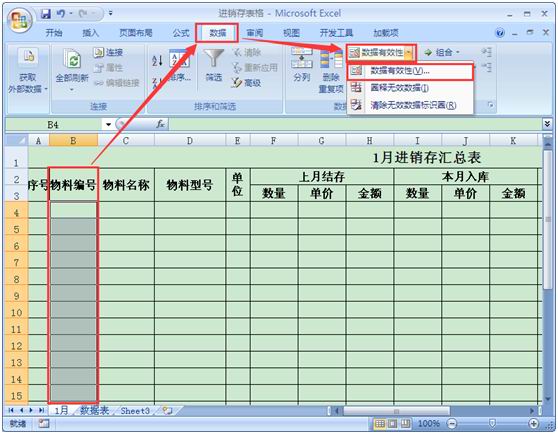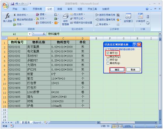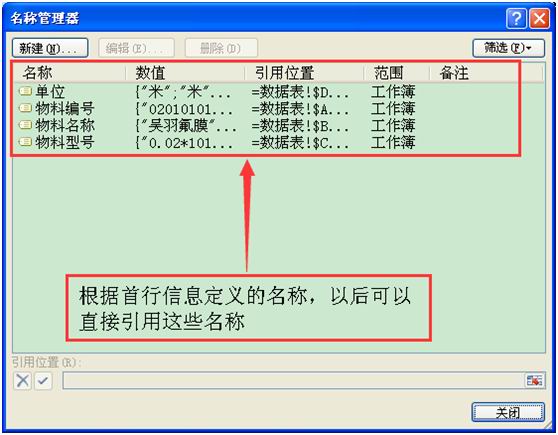 4.在彈出的界面中,選擇【首行】,并點擊【確定】按鈕。 注意:運行的結果是將A2:A15的區域定義為“物料編號”這樣一個名稱,B2:B15的區域定義為“物料名稱”, C2:C15的區域定義為“物料型號”,D2:D15的區域定義為“單位”。Ctrl+F3可以查看定義的名稱。 打開【名稱管理器】 5.回到“1月”的表中,選中B列空白區域,點擊【數據】-【數據有效性】- 選擇下拉菜單中的【數據有效性】按鈕。 6.在彈出的界面中,按照下圖在【允許】的下拉菜單選擇“序列”,勾選【提供下拉箭頭】,來源處輸入:=物料編號。設置完成后點擊【確定】按鈕。 7.操作完成后,我們點擊B列的空白單元格提供的下拉菜單,就可以快速錄入物料編號了。