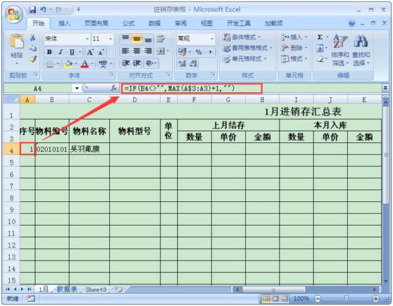 9.選中A4單元格,雙擊并輸入:=IF(B4<>"",MAX(A$3:A3)+1,""),自動生成序號,并填充。 注意:此處IF函數的意義和C列的一樣。