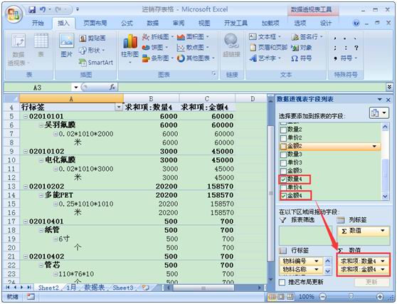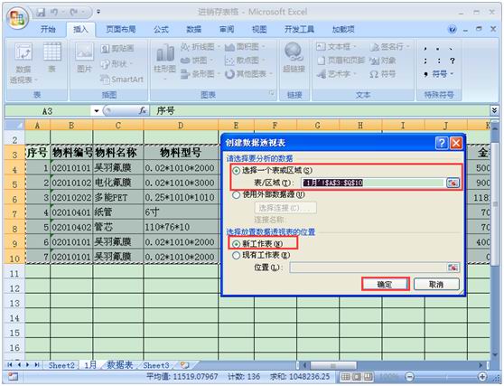 16.最后一步:月末統計結存數量、金額和平均單價。 首先,選中數據區域,選擇【插入】-【數據透視表】,如下圖設置內容后,點擊【確定】按鈕。 17.將最后一列的【數量】和【金額】拖到【數值求和】框內,將【物料編號】和【物料名稱】放入【行標簽】區域,并適當調整數據透視表格式和字段名稱,結果如下: