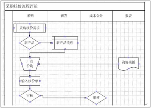 下面一張流程圖,是我一個客戶的采購核價流程。別看只是這么簡單的一張流程圖,其包含了很豐富的內容。