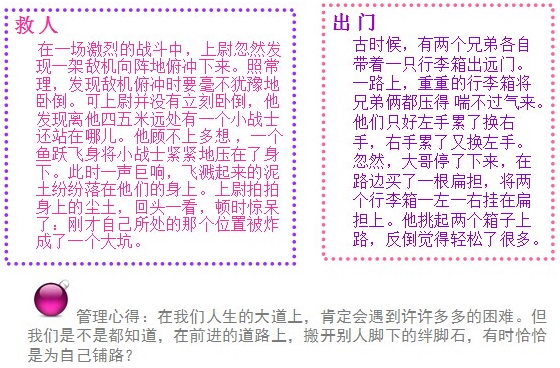 于是個經(jīng)常向人訴說心中的苦惱:“我真不明白,我捕魚的技術(shù)這么好,我的兒子們?yōu)槭裁催@么差?我從他們懂事起就傳授捕魚技術(shù)給他們,從最基本的東西教起,告訴他們怎樣織網(wǎng)最容易捕捉到魚,怎樣劃船最不會驚動魚,怎樣下網(wǎng)最容易請魚入甕。他們長大了,我又教他們怎樣識潮汐,辨魚汛。。。凡是我長年辛辛苦苦總結(jié)出來的經(jīng)驗,我都毫無保留地傳授給了他們,可他們的捕魚技術(shù)竟然趕不上技術(shù)比我差的漁民的兒子!” 一位路人聽了他的訴說后,問:“你一直手把手地教他們嗎?” “是的,為了讓他們得到一流的捕魚技術(shù),我教得很仔細(xì)很耐心。” “他們一直跟隨著你嗎?” “是的,為了讓他們少走彎路,我一直讓他們跟著我學(xué)。” 路人說:“這樣說來,你的錯誤就很明顯了。你只傳授給了他們技術(shù),卻沒傳授給他們教訓(xùn),對于才能來說,沒有教訓(xùn)與沒有經(jīng)驗一樣,都不能使人成大器!”