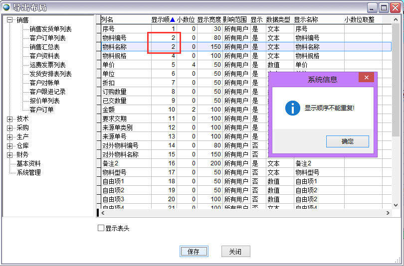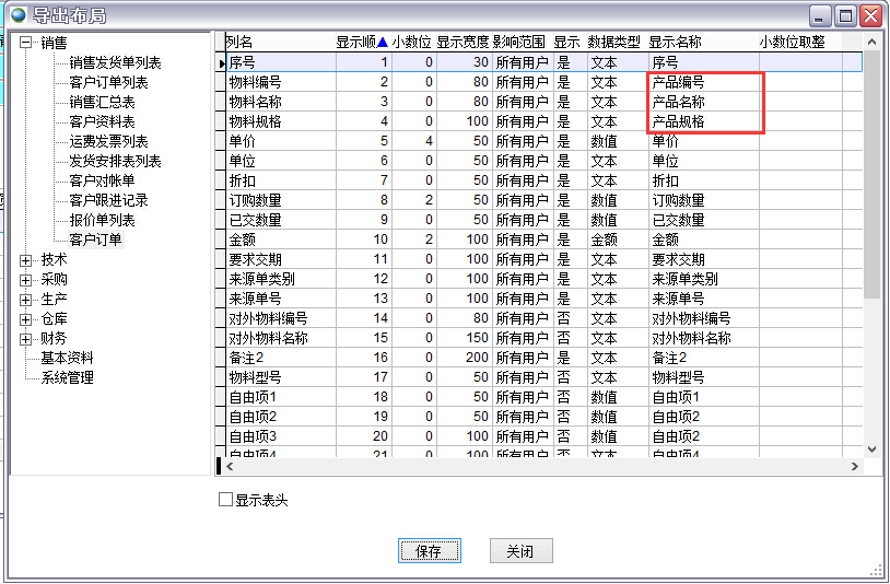 現在改變物料編號和物料名稱的顯示順序,保存導出布局。然后重新打開客戶訂單,此時物料名稱的顯示在物料編號之前。