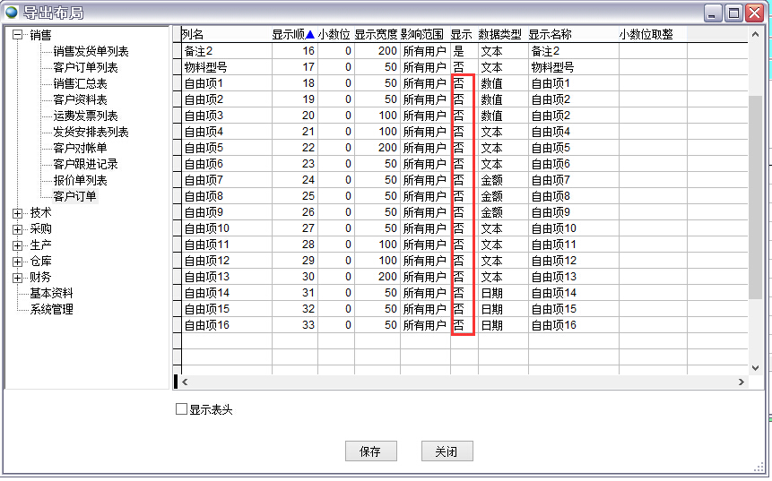 這些自由項字段設置為隱藏,在導出的excel中這些列就是隱藏的